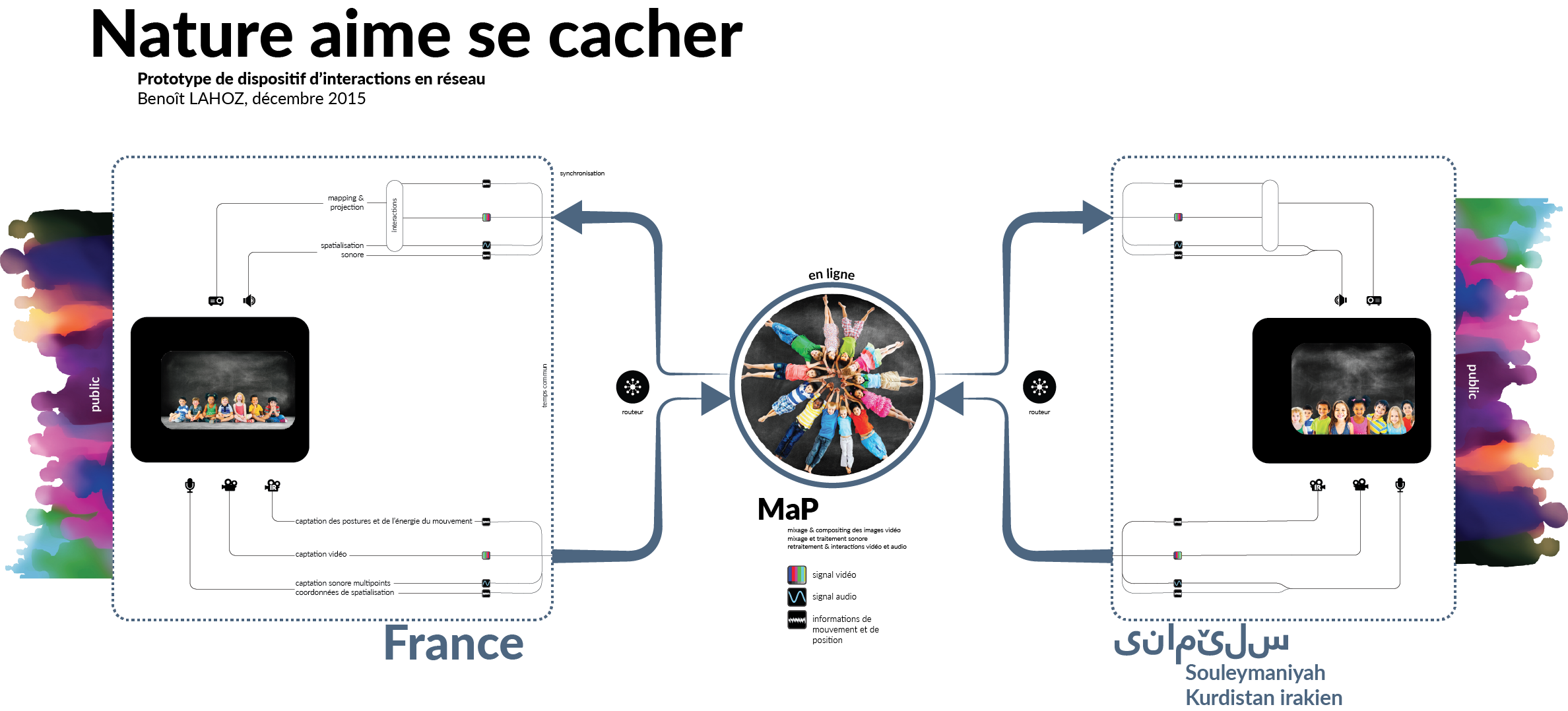 Ceci afin de créer un espace commun dans le réseau et de permettre au public d'assister au spectacle des enfants kurdes depuis la France, avec une forte sensation de présence. Celle-ci est créée notamment par le mapping de la captation vidéo kurde dans l'espace français, la respatialisation de l'univers sonore et par la captation des gestes des enfants, qui interagissent avec l'espace physique français.